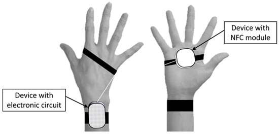 The tag reader consisted of two watch-like devices linked to one another. During the intervention (i.e., when the technology system was used), one of the devices (4.5 × 4.5 × 0.9 cm) was strapped to the palm of the participants’ right hand (see Figure 2) and contained an NFC module which was designed to identify the tags attached to the different boxes with objects. The other device (6.5 × 4 × 1.5 cm) was strapped to the participants’ right wrist and contained an electronic circuit that was designed to send the smartphone Bluetooth signals about the tags identified.