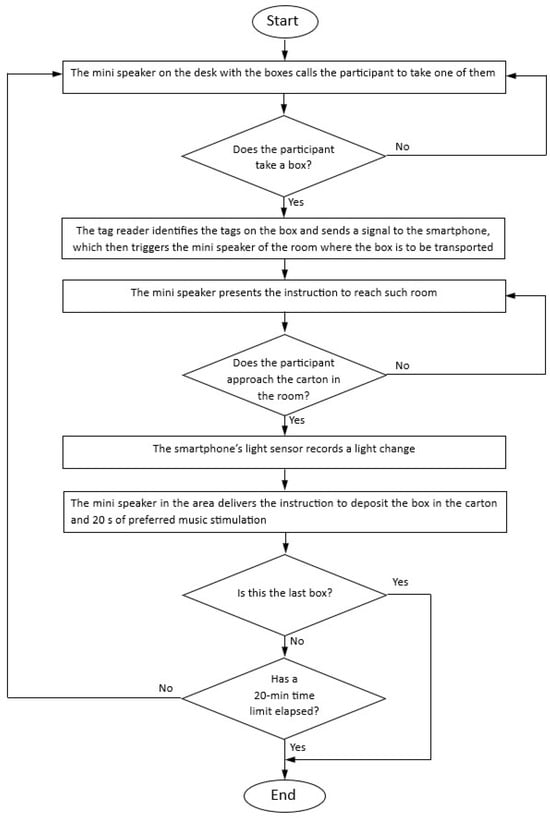 As soon as Edgar placed a box in the cart, the tag reader would identify the tags attached to the box and send a signal to the smartphone. The smartphone decoded the signal and activated (via the MacroDroid) the mini speaker of the destination room where the box was to be transported and deposited. The mini speaker presented encouragement (orientation) messages, as it had done for the other participants. Once in the room, he was to take the box from the cart, causing a change for the smartphone’s light sensor. This change led the MacroDroid to trigger the emission of the instruction to put the box in the carton. About 5 s after this instruction, a 20 s presentation of preferred music started. The end of the music led to the instructions to reach the storage room and take a box. The same process was followed for the other boxes to be used during the session.