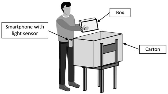 Once the participants entered the room and approached the carton where the box was to be deposited, the smartphone’s light sensor detected a light change (i.e., a reduction in light intensity caused by the smartphone’s proximity to the carton; see Figure 4). Based on this change, the MacroDroid caused the mini speaker available in the area to deliver (a) the instruction to deposit the box in the carton and (b) (3–4 s thereafter) 20 s of preferred music stimulation. Once the stimulation was over, the MacroDroid triggered the mini speaker of the storage room to present the instructions to reach the desk and take a box (see Section 2.3). The box was then to be transported to the pertinent destination room following the procedure described above. The same procedure was applied to each box to be collected, transported, and deposited during the session.
