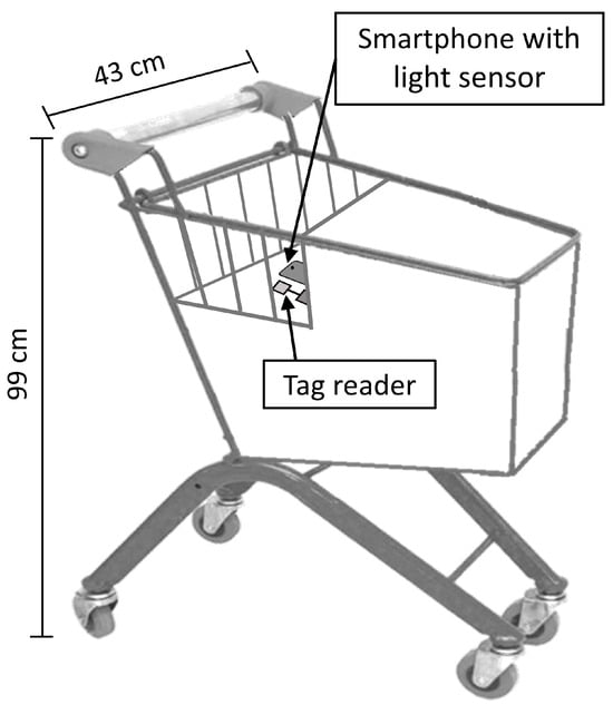 The technology system used for the seventh participant (i.e., Edgar) included the same components as the system used for the first six participants. Yet, the position and functioning of some of those components differed as Edgar walked with the support of a shopping cart and used the cart for transporting the boxes (see the Participants Section). The cart was adapted so that (a) only a small sector of it (i.e., the one close to the handle) was open and accessible for placing the boxes (see Figure 5) and (b) the tag reader and the smartphone were fixed at the bottom of that sector (see Figure 5).