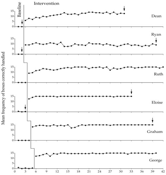 The figure reports the baseline and intervention data for the first six participants. Each data point represents the mean frequency of boxes correctly handled per session over a block of two sessions. Blocks of three sessions are marked with an arrow.