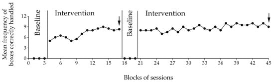 The participants’ frequency of boxes correctly handled during the baseline and intervention sessions was summarized in graphic form. The difference between the baseline and the intervention frequency levels was assessed through the Percentage of Nonoverlapping Data (PND) method []. This method, which is a practical tool for the evaluation of single-case research data, allowed us to verify for each participant the percentage of intervention sessions in which the frequency of boxes correctly handled was higher than the highest baseline value.