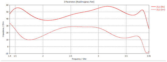 Moving forward, the rest of the graphs that describe the behavior of the optimal antenna should also be examined. Apart from the graph, the impedance graph of the antenna is also significant, as its values should represent good impedance matching between the patch and the line, in order for the energy to be transferred without major losses to the following component of the system. Ideally, the value of the antenna impedance response should be as close to as possible across the operation bandwidth. As depicted in Figure 5, from 1.4 to 3.9 GHz, the reactance value has a mean value below , and the resistance is across the whole band. These values are vastly acceptable, as perfect matching cannot be realistically achieved in a bandwidth as large as 2.5 GHz, but the small reactance and resistance close to prove that the antenna indeed has ultra-wideband characteristics from to 1.4 to 3.9 GHz, including all the aforementioned technologies (GSM, UMTS, Wi-Fi, LTE, 5G NR).