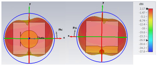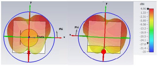 Last but not least, another key attribute of antennas for rectenna applications is their omnidirectionality. Omnidirectionality is significant in RF energy harvesting scenarios, as the direction of arrival of the incident field is usually unknown and it varies in recent technologies, i.e., beamforming in 5G NR. As depicted in Figure 6, for the first resonant frequency, GHz, the 3D radiation pattern of the optimal antenna has omnidirectional characteristics, which are also maintained throughout the operating frequency band, making the optimal antenna a perfect fit for RF harvesting applications. Specifically, while it is higher in the frequency band, the 3D pattern slightly loses its omnidirectionality, as depicted in Figure 7, for the second resonant frequency, GHz. However, this change is not important and the design can be considered omnidirectional across the whole band. The slight changes in the pattern are also expressed as a difference in the Gain, varying from 2.2 dBi at GHz to 4.9 dBi at GHz, as shown below. It must be noted that although the radiation pattern seems to have some asymmetric behavior, probably due to the asymmetric stub, the Gain values are very good for all the operating frequency bands.