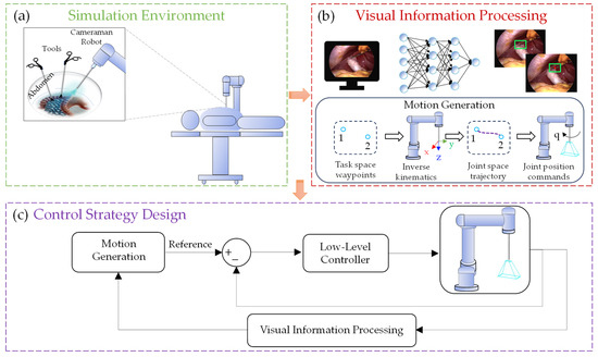 For a camera-holding robot to assist the surgeon with a degree of autonomy, robust environmental perception and control strategies that adapt to changing conditions are essential. A widely adopted approach to maintaining an appropriate FOV involves dynamically adjusting the vision sensor’s position based on the movement of surgical instruments [7,8,9,10,11]. In this context, artificial intelligence (AI) has driven the development of image-guided robotic surgery, often employing hierarchical control architectures. These are characterized by two primary levels: low-level control, responsible for executing movements through robot and tool regulation, and high-level control, tasked with planning and decision-making based on surgical requirements and visual data.