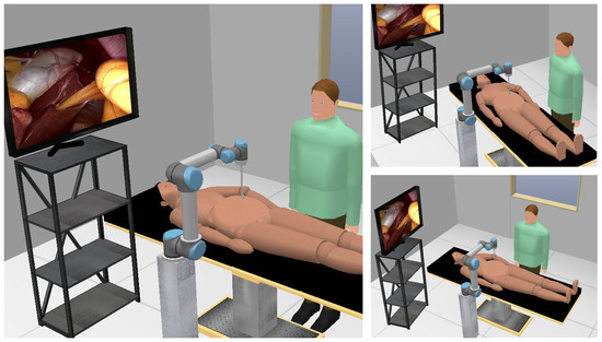 For the validation of the designed control strategies, CoppeliaSim [32] was employed—a software platform integrating multiple physics engines and enabling advanced modeling of soft tissues, simulation of tissue deformations, physiological movements, rigid body dynamics, and instrument–tissue interactions with high-precision contact models. This capability supports progressive testing as the research advances, within high-fidelity surgical scenarios [9,33].