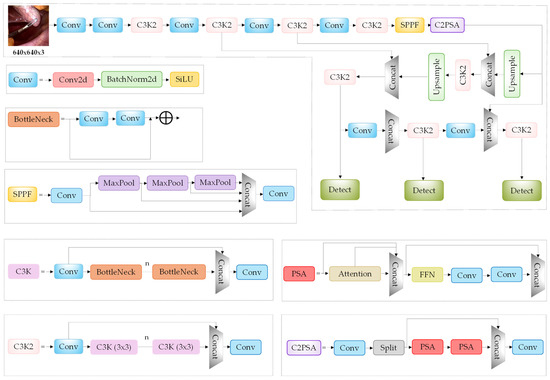 YOLO11 architecture. The diagram illustrates the main components of the model: convolutional layers (Conv) combined with C2PSA blocks at the top, processing pathways featuring BottleNeck and SPPF on the left, and specialized modules such as PSA, FFN, and Detect blocks.