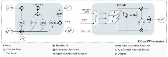 CfC-mmRNN neural network architecture. The figure illustrates the combination of Closed-Form Continuous-Time (CfC) networks with LSTM, forming the CfC-mmRNN architecture. On the left, a traditional LSTM cell is depicted, while on the right, the CfC cell is shown, incorporating a time vector and neural network heads (g, f, h). This integration enhances computational efficiency and the modeling of temporal dynamics.