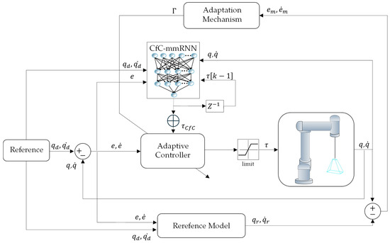 The control law, defined in Equation (7), integrates the CfC-mmRNN-based inverse model [k] with PD and adaptive terms for robustness and stability: