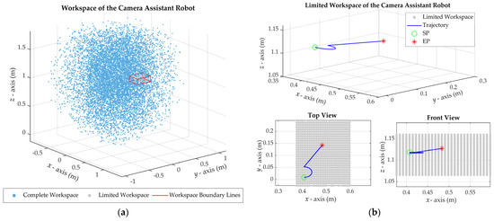 To ensure surgical safety and fidelity, constraints were established using virtual hyperplanes that delimit the workspace, preventing collisions between the laparoscope and tissues. A fraction of the robot’s total operational space was defined with the following dimensions: [x: 0.3769 m to 0.5969 m, y: −0.025 m to 0.245 m, z: 0.9757 m to 1.1547 m]. Additionally, the Remote Center of Motion (RCM) constraint was implemented virtually—a critical element in minimally invasive surgery—enabling surgical instruments to pivot appropriately around the insertion point without causing displacements that could compromise patient safety [35,36,37].
