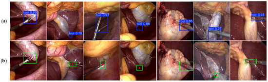 The CholecSeg8k dataset [43], comprising 8080 annotated laparoscopic cholecystectomy images (854 × 480 pixels, PNG format), is derived from 17 videos performed by 13 different surgeons (Figure 3). This dataset, an extension of Cholec80 [44], provides extensive diversity in surgical techniques and anatomical variability, while also presenting challenging conditions such as low illumination, blurriness, opacity, smoke presence, and a range of surgical instruments varying in size and depth. This richness of scenarios makes the dataset particularly suitable for our study, as its variability enhances the robustness and generalization capability of the trained detection model.