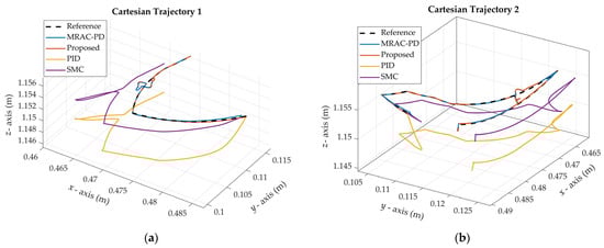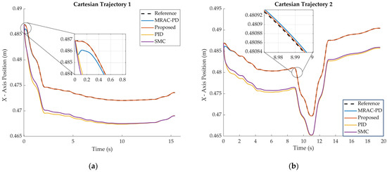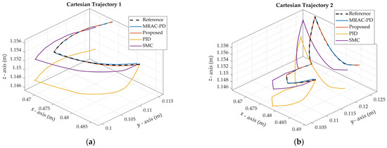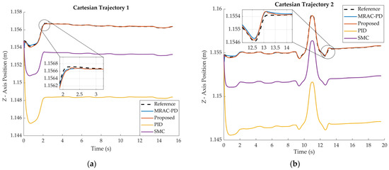 Model Reference Adaptive Control (MRAC) stands out as a prominent adaptive control approach, dynamically adjusting its parameters based on a predefined reference model to optimize system performance amid uncertainties and dynamic variations. MRAC has broad applicability in aerospace, renewable energy, and industrial and service robotics [19,20]. In [21], an MRAC based on Robust Fixed Point Transformations (RFPTs) was implemented in a master–slave system for soft tissue surgery, enabling the slave arm to accurately replicate the surgeon’s movements.