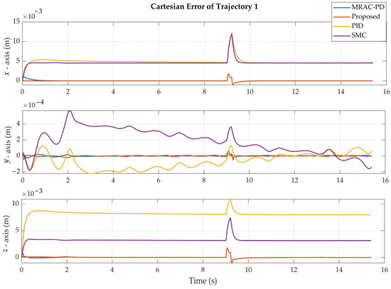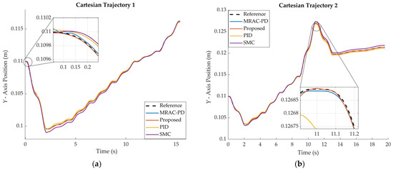 The proposed low-level control consists of a Model Reference Adaptive Control scheme with Proportional–Derivative (PD) terms (MRAC-PD), leveraging its ability to manage nonlinear dynamics without requiring an exact mathematical model of the system. As demonstrated in prior studies [47,48], this configuration maintains accuracy in the presence of parametric uncertainties. The PD component enhances response speed and reduces overshoot, which is critical when manipulating delicate anatomical structures. Unlike conventional controllers such as PID, whose performance degrades significantly under nonlinear conditions, or Sliding Mode Control (SMC), which introduces high-frequency oscillations detrimental to surgical instrumentation, MRAC-PD generates smooth control signals and sustains adaptive robustness.