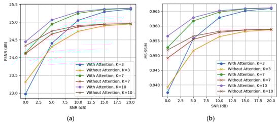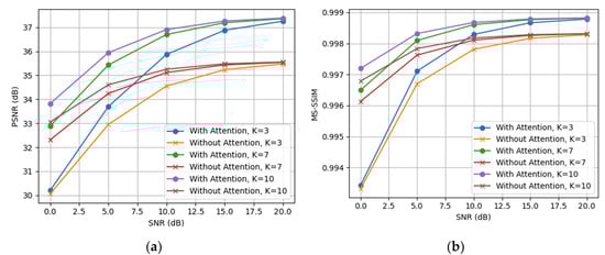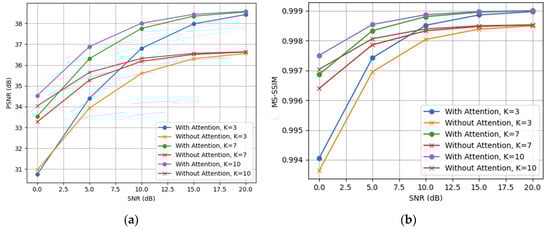 Furthermore, for a comparison of the proposed deep learning-assisted system with and without attention mechanisms, this paper is limited to the performance evaluation in terms of the PSNR, the MS-SSIM, and reconstructed image visualization. Hence, to contextualize this paper’s contributions within the broader landscape, we are planning to extend our analysis in future research works by including more expansive comparisons with supplementary benchmarks from the current literature. Additionally, it is vital for future work to report on additional metrics, such as the system compression ratio, computational complexity, and computation time analysis, for comprehensive evaluation.