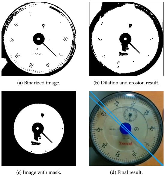 To ensure the accurate detection of the primary needle and to minimize interference from secondary needles and background noise, the input image of the detected dial undergoes the following preprocessing steps. (1) The input image is converted from a color image to a grayscale image, and all areas except for the dial are cropped to reduce unnecessary information. (2) The grayscale image undergoes binarization, making the pixel value into 0 (black) or 255 (white) based on a set threshold, generating a high-contrast edge image. This step emphasizes the structural features of the needle and scale while eliminating redundant background noise. As shown in Figure 5a, the background is effectively removed after binarization, leaving the needle and dial structure more distinct. (3) The following dilation and erosion operations are applied to the binarized image. These steps aim to further enhance the needle’s contour and reduce false edges caused by noise or secondary needles: