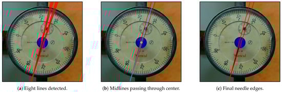 First, eight candidate lines are detected using the Hough transform instead of the traditional two-line approach. This parameter selection is based on experimental observations, where typically six to eight edge lines are often detected in the needle region of the dial. Increasing the number of candidate lines ensures that more potential needle edges are captured, reducing the risk of missing critical information. However, the number of candidate lines is limited to eight to prevent noises from introducing false positives. As shown in Figure 6a, this proposal successfully identifies eight candidate lines in the needle region, which are indicated by red lines in the figure.