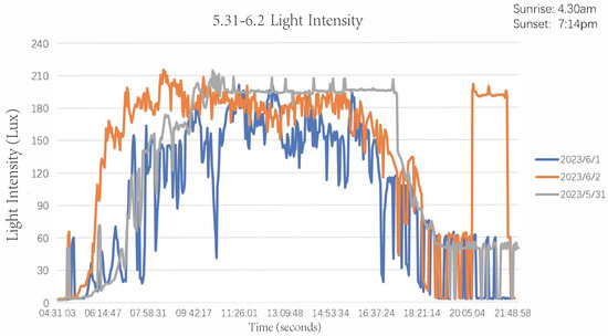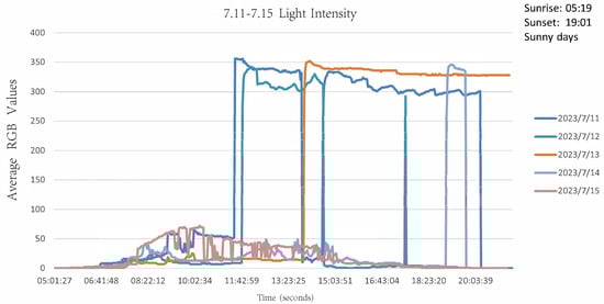 Experimental results show that when the average RGB value of an image exceeds 180, it meets the requirements. As shown in Figure 10, the three-day experimental measurements of average RGB values indicate that when the RGB value is low, images are not discernible, whereas values above 180 allow for sufficient detail recognitions. Additionally, to ensure that experiments are conducted under appropriate lighting conditions, we measured variations in the light intensity in the laboratory under different scenarios. As shown in Figure 11, the laboratory’s light intensity fluctuates significantly due to natural lights and intermittent operations of other experimental equipment, which may cause temporary activations or deactivations of indoor lighting.
