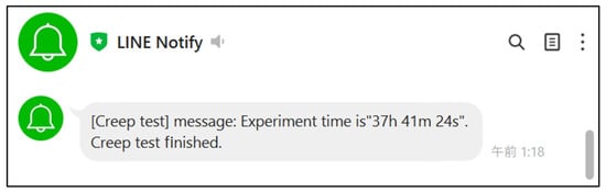 To ensure that experimenters are always informed about the experimental status, the system employs the LINE Notify API for remote notifications. As shown in Figure 13, the system sends real-time notifications to users when the specimen fractures or the experiment concludes. Additionally, the non-English information in the figure indicates that the received time is 01:18. Furthermore, the system supports the scheduled notifications, periodically sending updates on experimental progress and measurement results. The notification intervals can be freely configured by the user, ensuring that experimenters can stay updated on the experimental progress even when they are outside the laboratory.