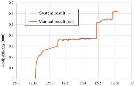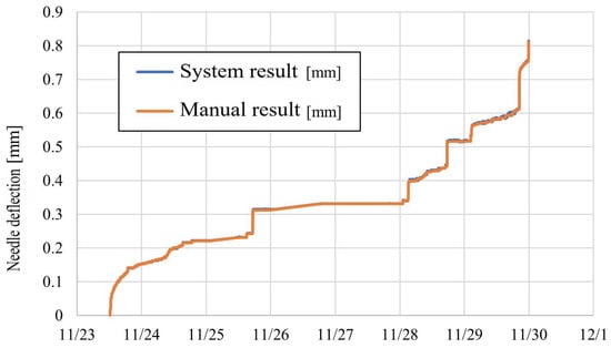 In the second experiment, the system operated for min, collecting the same number of data points. The average measurement error was 0.00097, indicating further improvement in accuracy, likely due to optimized image processing algorithms and long-term operational stability. The smart lighting function was activated 42 times due to fluctuating environmental conditions, with a total usage time of 251 h and 18 min, accounting for 70.1% of the total experimental duration. Figure 15 shows a comparison between the system and manual measurements, confirming the system’s consistent performance. The data reveal the enhanced stability over extended durations, with error trends indicating minimal drifts. The higher activation frequency of the smart lighting mechanism during this longer experiment underscores its dynamic adaptability to environmental changes. These findings highlight the system’s robustness in maintaining high accuracy and energy efficiency over prolonged testing periods.