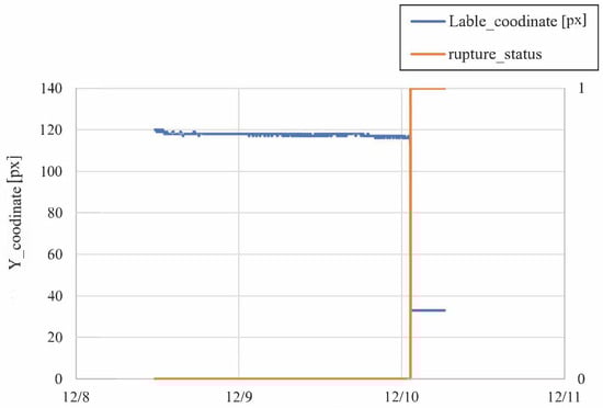 The fracture detection capability of the system was evaluated during the second experiment. Figure 16 illustrates the process where the “rupture state” variable transitioned from 0 (intact material) to 1 (ruptured material). During the test, the marker’s y-coordinate gradually decreased from 120 px to 113 px as the material deformed. Upon rupture, the y-coordinate abruptly dropped to 33 px, triggering an update in the rupture state. This transition activated the LINE notification to the laboratory personnel, ensuring prompt awareness of the fracture event. The analysis demonstrates the system’s sensitivity to rapid changes in material conditions and its ability to accurately classify rupture events. Additionally, the automated notification mechanism achieved an average response time of 5 s, further validating the system’s practical applicability in laboratory environments. These results confirm the reliability of the fracture detection method described in Section 4 and highlight its effectiveness in ensuring timely interventions during critical experimental moments.