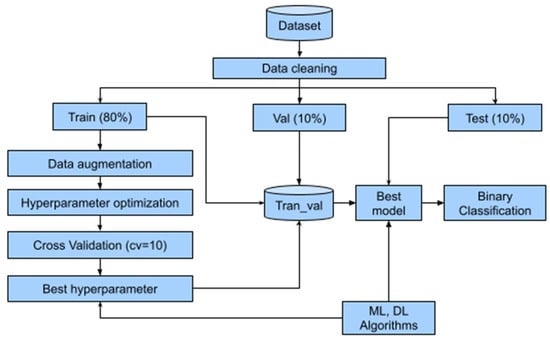 The methodology, shown in Figure 1, begins with the identification of the bank fraud dataset, where all records and features underwent data cleaning to remove empty values, duplicates, and features with zero variance. Next, the dataset was split into 80% for training, 10% for validation, and 10% for testing. In the training subset, data augmentation techniques were applied to balance the minority class with the majority class. For optimal hyperparameter selection, a cross-validation procedure (cv = 10) was implemented to improve the model’s generalization capacity. The optimal model (best model), after validation, was then evaluated using the testing set to measure the performance of the ML and DL models.