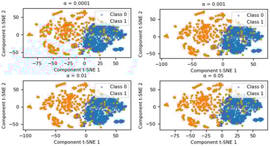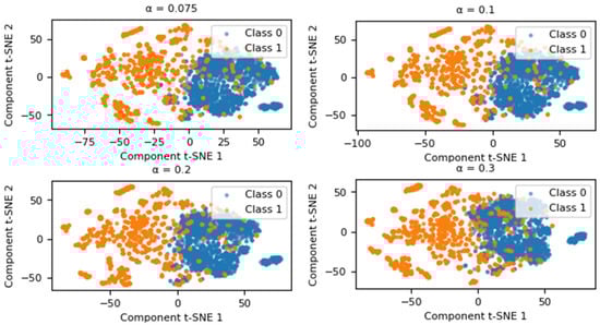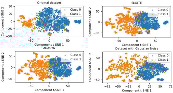 The generation of new data by adding Gaussian noise largely depends on the value of . To determine the best representativeness of the new data in relation to the original values, experiments were conducted with different values of . As shown in Figure 2, these experiments allowed the magnitude of the noise to be adjusted to achieve better data quality. T-SNE was used to visualize the data in two dimensions. The blue points represent the majority class (Class 0), while the orange points represent the minority class (Class 1).