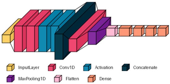 DL architecture in the context of fraud detection presents a promising solution [,]. In this study, a convolutional neural network (CNN) is presented, based on the model proposed in [], to which a specific adaptation was made for the dataset used. Figure 4 presents the modified architecture, which consists of an input layer equal to the number of descriptors in the dataset. A parallel processing section is included, consisting of two convolutional branches. Each branch has 16 filters with different kernel sizes (7, 11). The outputs are merged using a concatenation layer that integrates the extracted features. Next, sequential processing is performed by adding a convolutional layer with 8 filters and a kernel size of 7, followed by a MaxPooling1D layer (pool_size = 2) to reduce data dimensionality. The output of this layer is flattened to feed into dense layers that learn more abstract representations of the data. Three dense classification layers with 256, 120, and 64 neurons were added to the architecture. The convolutional and dense layers used the ‘ReLU’ activation function. Finally, a dense layer with a single neuron and a ‘sigmoid’ activation function was added for binary classification.