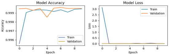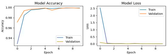 For the synthetic dataset generated using SMOTE (Figure 6), the accuracy graph exhibits stable behavior with significant improvement, achieving the highest validation accuracy (val_accuracy) score of 0.99937. This performance can be attributed to the increased diversity of the training set, which enhances the model’s generalization capability. The loss graph demonstrates a sharp decline during the first epoch, decreasing from values close to 2.5 to near 0, indicating rapid assimilation of the patterns present in the synthetic data. A similar trend is observed for the ADASYN generated dataset (Figure 7), which attains a val_accuracy of 0.99912. The loss graph for ADASYN also shows a pronounced initial decrease followed by stabilization, reflecting adequate model convergence. Finally, for the dataset augmented with Gaussian noise (Figure 8), the accuracy plot yields a val_accuracy of 0.99944. This result suggests that the introduction of Gaussian noise enhances model robustness by increasing variability in the training and validation data. Collectively, these results demonstrate the CNN’s high effectiveness in handling datasets with data augmentation techniques, maintaining stable performance and achieving near-perfect accuracy in all cases.