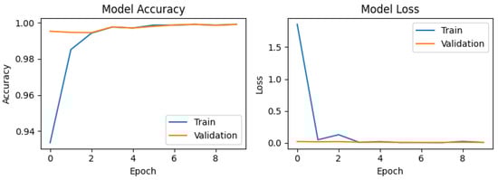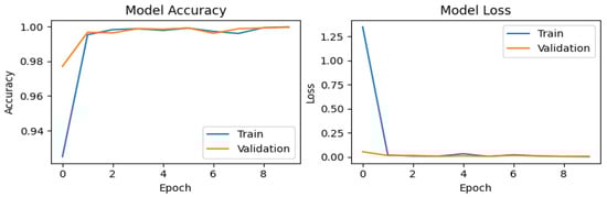 The CNN was trained for 10 epochs, with a batch size of 64, using the Adam optimizer, a learning rate of 0.001, and the loss function “binary_crossentropy”, suitable for binary classification problems. During this phase, callbacks were included to improve the generalization ability of the models and avoid overfitting. The callbacks included ModelCheckpoint, which saves the model with the best score (monitor = ‘val_accuracy’) on the test set; ReduceLROnPlateau, with monitor = “val_loss”, factor = 0.1, patience = 3, and min_lr = 1 × 10−7. Additionally, CSVLogger was used to log the training progress to a CSV file, TensorBoard to visualize the training and validation metrics, and EarlyStopping to stop the training if “val_loss” did not improve after four epochs. These callbacks were used to enhance the performance and generalization of each model during this phase.