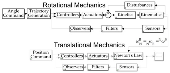 Space robot system topology represented by the MATLAB®/SIMULINK® simulation used to produce the quantitative results presented in this manuscript. The internal content of simulation subsystems is depicted in Appendix B. Notice that the translational subsystems of the six-degree-of-freedom motion simulation are deactivated, reducing the superfluous computational burden.