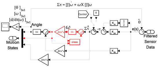 Notice Figure 5 contains predominantly the same content as Figure 4, the enhanced Luenberger observer. The new enhancements are depicted in the center of Figure 5 where the angular velocity signal is extracted, scaled by the mass moments of inertia, then used to create the cross-products which are added to the baseline double-integrator signal.