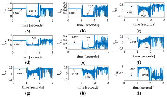 The feedforward instantiation of Equation (3) is presented in Equation (4), where the matrix of “knowns” necessitates having known angular velocities and angular accelerations. This necessity motivates the use of sinusoidal commanded trajectories, which will be shown to also aid estimation identifiability in Section 2.11.