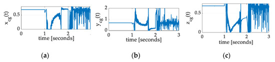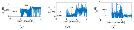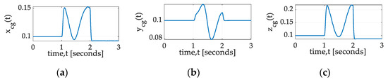 Ref. [19] categorized the methods slightly differently as either sensors’ networks or a single sensor while proposing using magneto-inertial measurement units. Calculation of the mass center was proposed [20,21,22] by electrostatic suspension of a proof mass in the satellite in an electrode cage, which is rigidly attached to the spacecraft. Accelerations of the proof mass were determined, and, then, relative accelerations between the spacecraft and proof mass were used to estimate the mass center. The procedure was used periodically to provide mass center location estimates. Follow-on experiments were presented in [23]. Arguably, this proof mass electrode cage may be considered state-of-the-art for spacecraft so equipped. The calculations involve estimations of angular velocities and quaternion fitting using regression (ASIDE: the methods proposed in this paper instead involve the estimation of all inertia components (moments and products) and use those estimates to deterministically calculate mass center location).