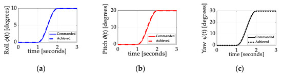 Pseudocode (labeled “Block Parameters”) used in the three “Interpreted MATLAB Fcn” blocks in Figure A1 encoding the angle (a), angular rate (b), and angular acceleration (c) commands, respectively. Top-to-bottom subsystems in Figure A1 correspond to left-to-right block parameters in this figure. The pseudocode is provided to aid repeatability of the research results.