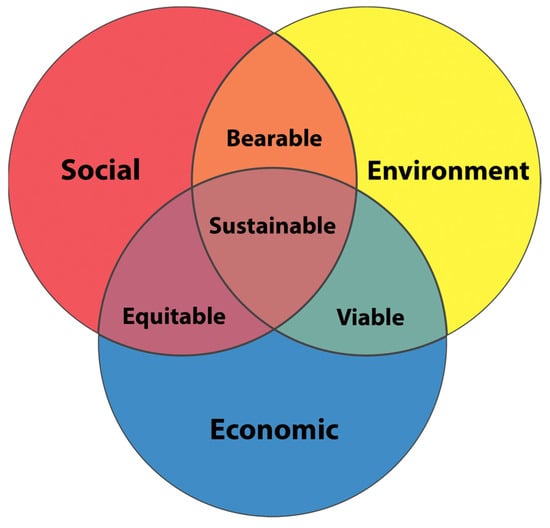 The three pillars of sustainability, or the triple bottom line, stipulates that all manufacturing industries and enterprises consider all three aspects thoroughly and simultaneously []. The concept is adapted through a model which sets up long-term strategies used by companies that are willing to make the transition from conventional practices to sustainable practices. The transition focuses on the three main pillars of sustainability: environmental quality, social equity, and economic benefits. This research field has a lot of accepted models that describe the three pillars of sustainability and how they overlap with each other, yet the most known and used one is the nested spheres model, which is also known as the Venn diagram explanation. The intersection of all three spheres is where sustainability can be illustrated, as shown in Figure 1 [].