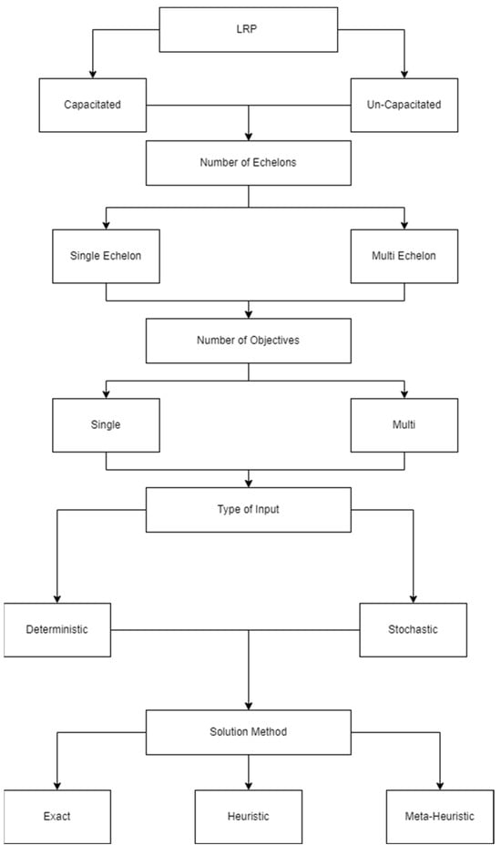 Xue Yu et al. classified LRP into several categories. The first category discusses the type of LRP—whether it is capacitated or un-capacitated. The second category is the number of echelons in the problem, whether it is a single-echelon or a multi-echelon problem. The third category is whether cost is the only objective to consider, making it a single-objective problem, or there are other objectives besides the cost, making it a multi-objective problem. The fourth category is the type of input data—whether it is deterministic, stochastic, or periodic. The fifth and final category is the type of solution to tackle, meaning whether the method is exact, heuristic, or meta-heuristic []. This classification is a preferred classification since it is sequential in nature. This gives an insight into how to tackle LRP by simply following each category and determining which direction to be taken for each category. Figure 2 shows the classification as discussed earlier, with each category being expanded on afterwards.