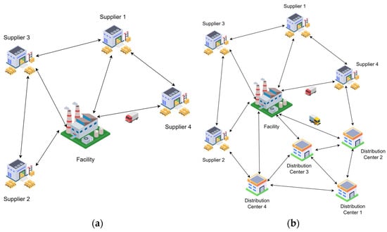 Two-echelon LRPs are very common in the literature, since they are a more realistic presentation of real-life logistics. Yong Wang et al. studied a two-echelon, multi-depot LRP with pickup and delivery. The aim of the study was to minimize the total operation cost and to improve the overall efficiency of the network. The scope of the model constructed was one logistics center serving multiple pick-up depots and distribution depots. This serves as the first echelon, while the second echelon is between the distribution depots, the pick-up depots, and the customer demand nodes []. Valeria Soto-Mendoza et al. tackled a collection and delivery open-location problem, which is a classic variant of LRP. The two-echelon model was constructed with one echelon collecting the required raw material from the suppliers, while the second echelon was responsible for delivering the final product produced to the customer nodes []. Xi-Dan Tian and Zhi-Hua Hu conducted a study of a two-echelon LRP with fixed relays. The first echelon was concerned with the transportation of the goods from the facility to the chosen relays, while the second echelon was responsible for the distribution of the goods from the relays to the customer nodes []. It can be seen from the literature sample presented that the meaning of a two-echelon LRP may differ from one variant of LRP to another. Figure 3a,b show the difference between a single-echelon and two-echelon problem.