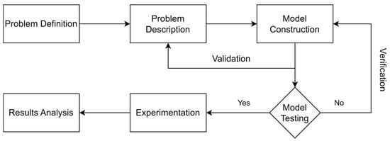 As the first step, the problem is defined and formulated; this includes explaining the problem clearly and defining the boundaries of the system. The second step is the construction of the model based on the assumptions made and the constraints restricting the model. The third step is model testing; this step is where the model is evaluated to make sure that it is functioning as required. The evaluation is performed in two steps: verification and validation. The fourth step is the experimental work to be implemented in the model. The fifth and final step is the analysis of the results. Each step will first be discussed generally, then extensively explained in a dedicated section. Figure 4 shows the process flow.