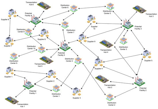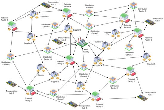 With the year 2030 now in sight, emphasis on turning conventional supply chains into sustainable ones is at an all-time high. All enterprises, of all sizes, are trying to align their goals with the ones set by world leaders for a more sustainable world as a result of the world being in a critical state []. The Sustainable Development Goals (SDGs) stressed by world leaders cover various aspects, from ending world hunger to gender equality. These goals are related to the original classification of sustainability, which has three categories—environmental, economic, and social, or as they are also called, the triple bottom line (TBL) []. In addition to the challenges normally faced by the traditional supply chain, such as, but not limited to, cost reduction and complying with market demands, the environmental and social demands of the pillars are also considered as challenges. This has come as a result of increased public awareness on the topic of sustainability, affecting the public’s decision to use an enterprise’s services or products based on goodwill. Whether discussing upstream or downstream areas of supply chains, implementing sustainable practices in these focal areas is a current necessity. One of the problems with such a focus is the location-routing problem.