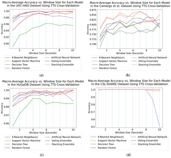 Trend graphs showing the mean accuracy across all models and window sizes for the four datasets in this analysis when using TTS cross-validation. (a) USC-HAD. (b) Camargo et al. (c) HuGaDB. (d) CSL-SHARE.