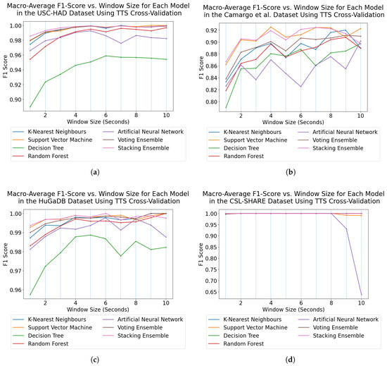 Trend graphs showing the mean F1-score across all models and window sizes for the four datasets in this analysis when using TTS cross-validation. (a) USC-HAD. (b) Camargo et al. (c) HuGaDB. (d) CSL-SHARE.
