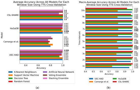 Model and window size effect on classification accuracy across all four datasets using TTS cross-validation. The highest-performing model for each dataset and window size is marked in bold. (a) Average accuracy for each model across all window sizes for each dataset. (b) Average accuracy across all models at each window size from 1 to 10 s for each dataset.