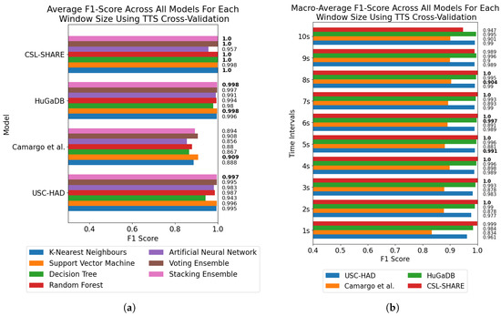 Model and window size effect on F1-score across all four datasets using TTS cross-validation. The highest-performing model for each dataset and window size is marked in bold. (a) Average F1-score for each model across all window sizes for each dataset. (b) Average F1-score across all models at each window size from 1 to 10 s for each dataset.