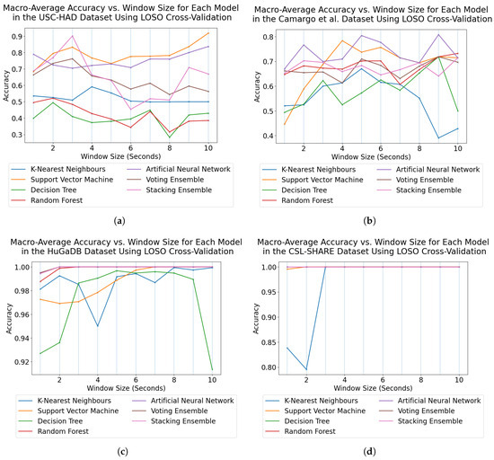 Trend graphs showing the mean accuracy across all models and window sizes for the four datasets in this analysis when using LOSO cross-validation. (a) USC-HAD. (b) Camargo et al. (c) HuGaDB. (d) CSL-SHARE.