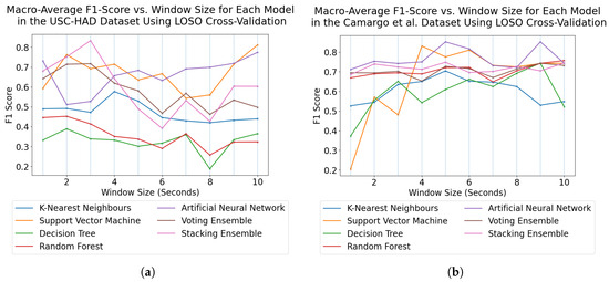 Figure 3 and Figure 4 show the average highest-performing model among all window sizes, along with the average accuracy and F1-score at each window size across all models. These figures highlight the SVM and the stacking ensemble classifier as the most capable models across all window sizes and that the best model performances occurred at window sizes of 4–8 s.