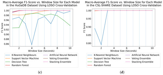 Trend graphs showing the mean F1-score across all models and window sizes for the four datasets in this analysis when using LOSO cross-validation. (a) USC-HAD. (b) Camargo et al. (c) HuGaDB. (d) CSL-SHARE.