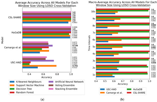 Model and window size effect on classification accuracy across all four datasets using LOSO cross-validation. The highest-performing model for each dataset and window size is marked in bold. (a) Average accuracy for each model across all window sizes for each dataset. (b) Average accuracy across all models at each window size from 1 to 10 s for each dataset.