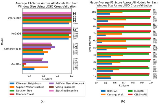 Model and window size effect on F1-score across all four datasets using LOSO cross-validation. The highest-performing model for each dataset and window size is marked in bold. (a) Average F1-score for each model across all window sizes for each dataset. (b) Average F1-score across all models at each window size from 1 to 10 s for each dataset.