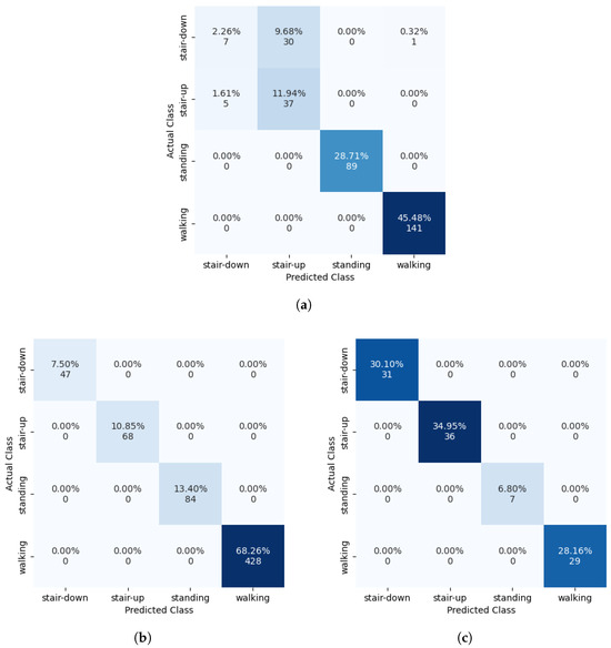 To assess the performance of each model, this study considered both macro-average accuracy and the F1-score. While macro-average accuracy provides a straightforward overview of a model by reporting the mean classification accuracy across all classes, it can be misleading in the presence of large class imbalances, as it does not account for differences in class distribution. To address this, the macro-average F1-score was also reported, which provides a more balanced measure of performance across classes. For each dataset, walking was the primary class, with around 10× more walking data than stair ascent and stair descent data. Standing data varied between datasets but were typically around 2–3× more numerous than data in the stair ascent and stair descent classes.