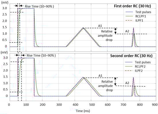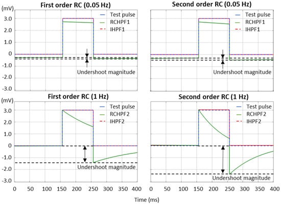 - The slope outside the pulse shall be less than 0.3 mV/s, according to the measurements for the 0.05 Hz first-order RC filter. This requirement is satisfied, as evidenced by the fact that the IHPF’s undershoot amplitude is more than three times smaller than that of the 0.05 Hz RC filter.